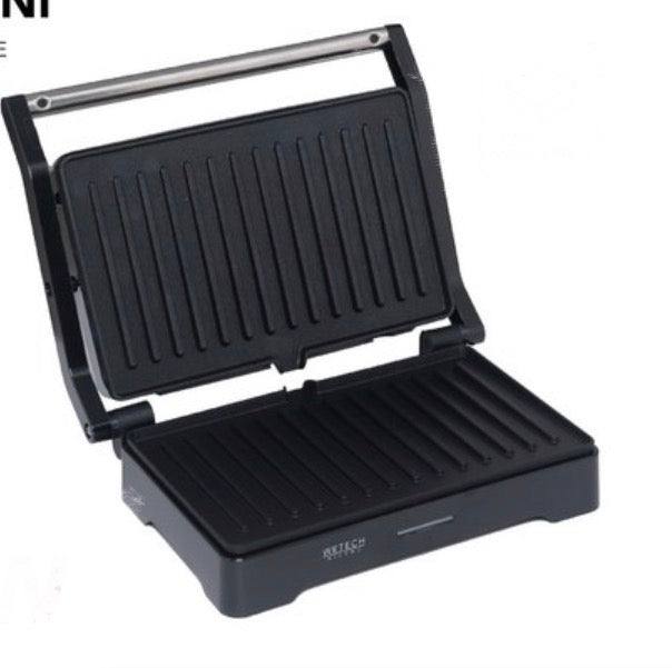 Piastra.Ha una finitura a righe su entrambe le piastre e una maniglia argentata. Sembra compatta e adatta per preparare toast, panini o grigliare piccoli alimenti.